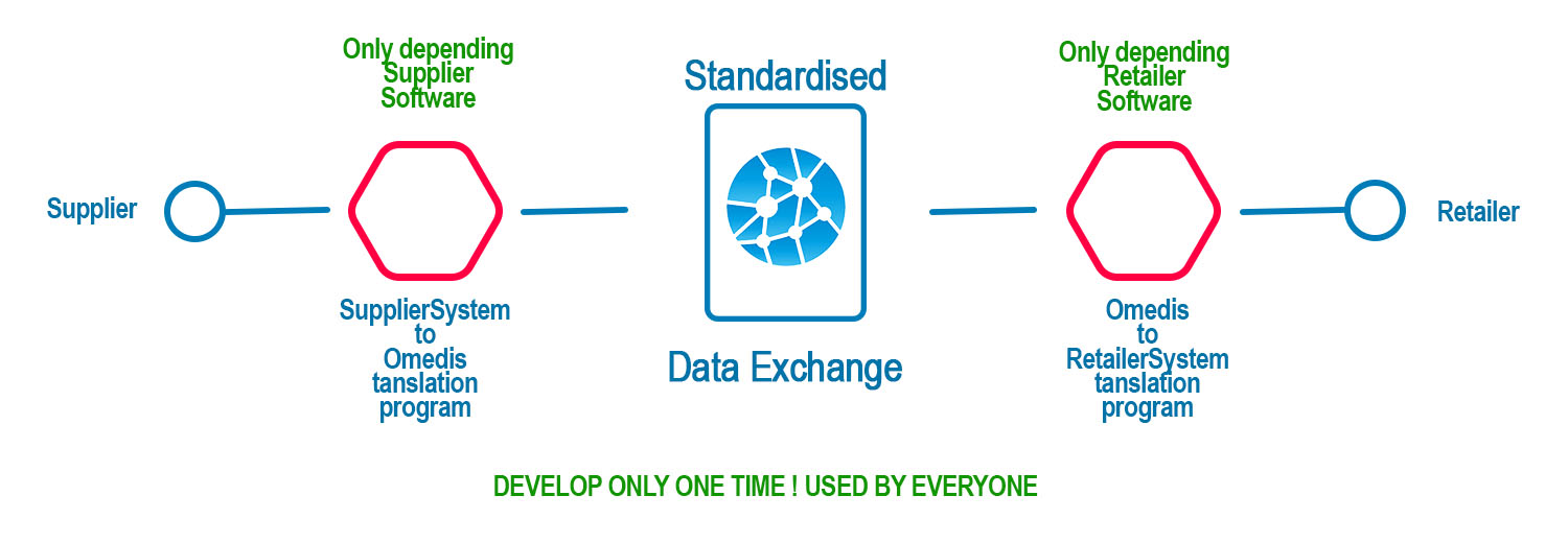 Thanks to this standard, each supplier has only to develop one translation program from his own ERP to OMEDIS. Each retailer has only to develop one translation program from OMEDIS to his own retail management system.